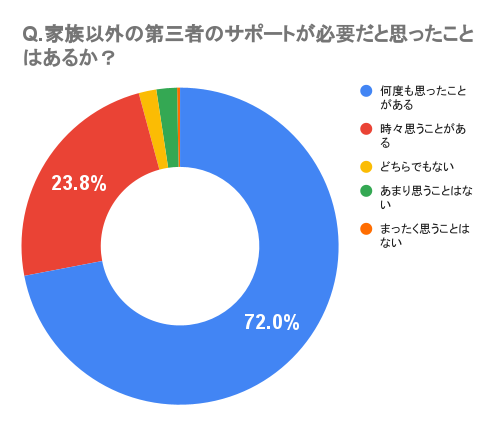「家族以外の第三者のサポートが必要だ」と「何度も思ったことがある」が72%、「時々思うことがある」が23.8%で、合計で95.8%の親がサポートを必要としていました。