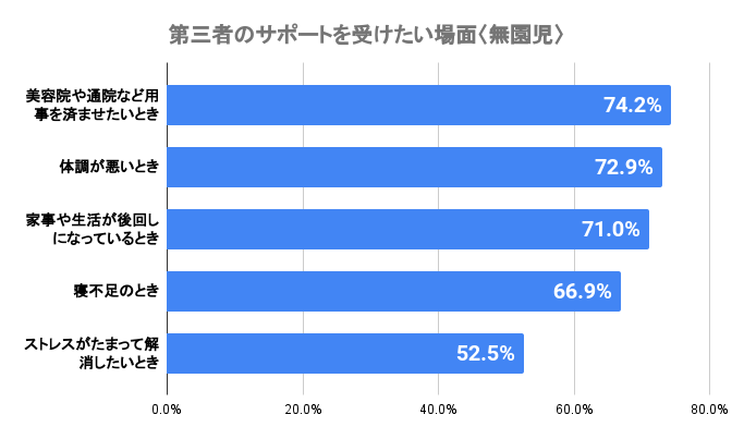 具体的に第三者のサポートを必要としている場面は「美容院や通院などの用事を済ませたいとき」が一位でした。「体調が悪いとき」「家事や生活が後回しになっているとき」も70%を超えています。