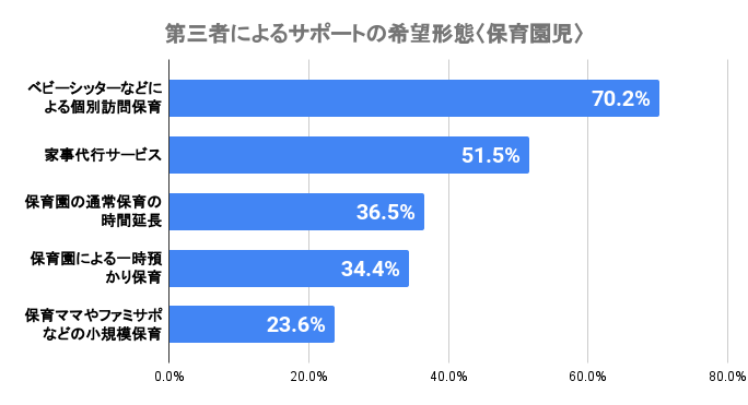 第三者によるサポートを受けられる場合に希望するサービス形態は「ベビーシッターなどによる個別訪問保育」となり、70.2%に及んでいます。その次には「家事代行サービス」が51.5%と、半数を超えました。