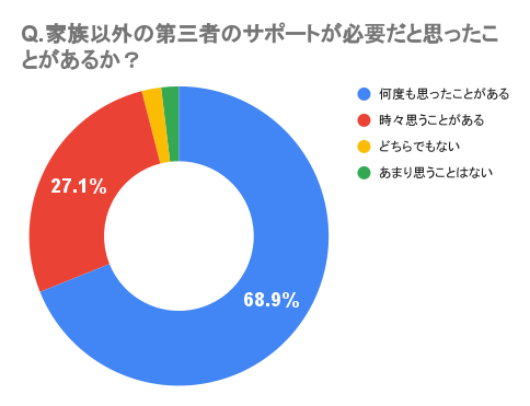 次に、「子育てにおいて家族以外の第三者のサポートが必要だと思ったことがあるか」という質問では、「何度も思ったことがある」が68.9%、「時々思うことがある」が27.1%となり、合計で96%の親が「第三者のサポートが必要」と感じていることが分かりました。