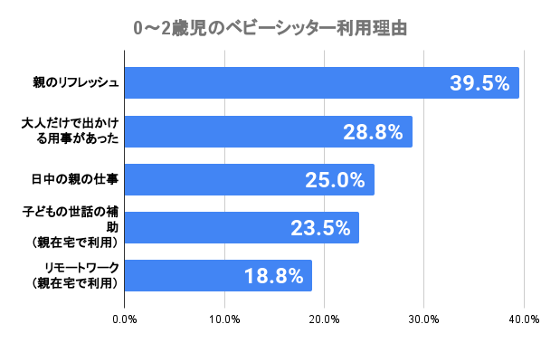 ベビーシッターを利用した理由の上位項目は、「親のリフレッシュ」が39.5%、「大人だけで出かける用事があった」が28.8%、次に「日中の親の仕事(25%)」と続きます。「子どもの世話の補助(23.5%)」「リモートワーク(18.8%)」など、親が在宅している状態で保育補助としてベビーシッターを利用するパターンも見受けられました。