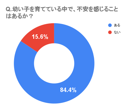 「幼い子を育てている中で、不安を感じることはあるか?」という質問をしたところ、84.4%が「不安を感じている」と回答しました。現状では子育て世帯の多くで、「不安を抱えている状態」であることが判明しました。