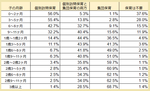 また、9ヶ月〜1歳5ヶ月までは「個別訪問保育と集団保育の両方がよい」という親が最も多くなっています。