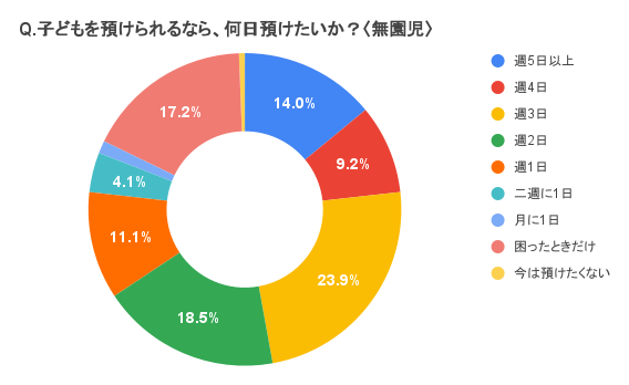 無園児の親が子どもを預けたい日数は、「週3日」が23.9%で最多となりました。「週5日以上」(14%)、「週4日」(9.2%)と合わせると、47.1%が「週3日以上預けたい」と考えていることがわかります。