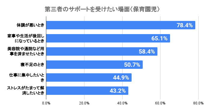具体的にどんな場面でサポートを受けたいかを聞いたところ、最も多かったのは「体調が悪いとき」(78.4%)でした。「家事や生活が後回しになっているとき」についても65.1%がサポートを必要としています。
