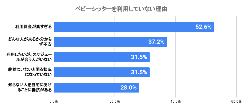 ベビーシッターを利用したことがない理由は、「利用料金が高すぎる」が52.6%と最も高く、「どんな人が来るか分からず不安」(37.2%)が続きます。「利用したいが、スケジュールが合う人がいない」も31.5%となり、3割以上の方が「使いたいが使えていない」状態であることがわかりました。