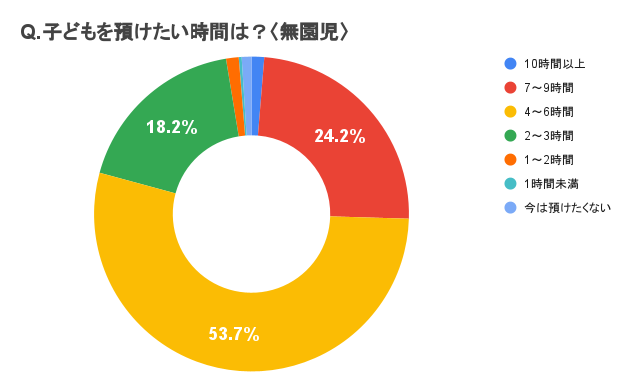 無園児を育てる親が子どもを預けたい時間は、「4〜6時間」が53.7%と半数を超えました。次に多いのは「7〜9時間」で24.2%です。