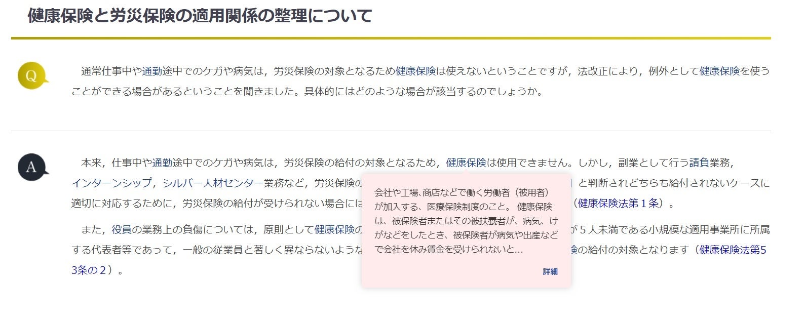 『Case&Advice 労働・社会保険Navi』のコンテンツから、青リンクが表示されている法律用語を選択すると「詳細」が表示されます。