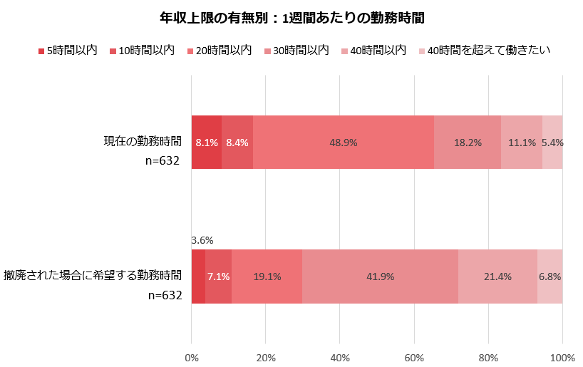 働く時間について聞いてみると、現在の勤務時間が20時間を超える人が34.7%だったのに対して、年収上限が撤廃された場合の希望では70.1%と倍増します。
