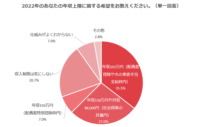 働くしゅふ層(主婦・主夫)に、2022年の年収上限の希望がどうだったか聞いてみたところ、「年収150万円(配偶者特別控除枠内)」「年収制限は気にしない」と答えた方の合計、つまり130万円を超えて働いた方は27.7%となりました。一方で、年収上限が撤廃された場合の希望を聞いてみると、「130万円超」を希望する方が74.7%で、昨年実際に130万円を超えて働いた方の比率の2.7倍となりました。