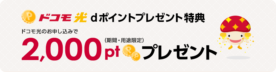 「ドコモ光」1ギガサービス(2年定期契約)を、新規・転用・事業者変更にてお申込みいただき、適用条件をすべて満たした場合、dポイント「 2,000pt 」をプレゼントする「ドコモ光」公式特典です。