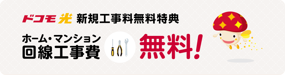 「ドコモ光」を新規でお申込みいただき、適用条件をすべて満たした場合、「ドコモ光」のネット回線工事料が無料になる「ドコモ光」公式特典です。