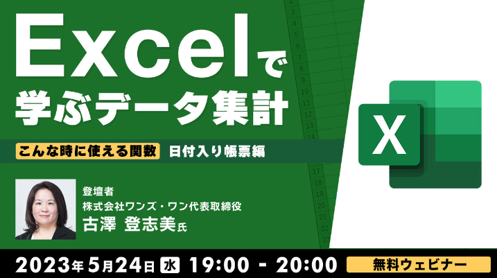 今回のセミナーでは、PC&IT講師として20年以上の経歴を持つ株式会社ワンズ・ワン代表取締役の古澤登志美氏にご登壇いただき、日付や年月日を求める際に使える、日付/時刻関数などついてわかりやすく解説していただきます。Excelでは、表やデータを作成する際にたびたび日付や年月日を入れることがありますので、関数をおぼえることで作業効率のUPとミスを防止することができます。事務職からデータ領域へ転職を検討されている方などに特におすすめの本セミナー。ご興味をお持ちの方は、ぜひご参加ください。