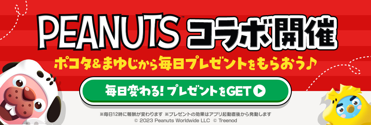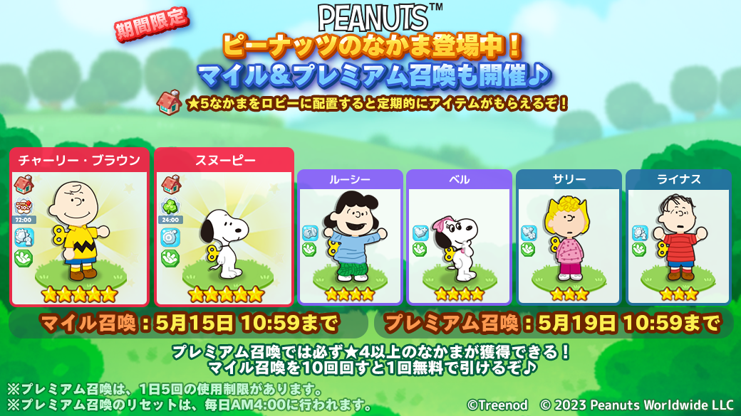 コラボ期間中に「スヌーピー」や「チャーリー・ブラウン」などピーナッツの仲間たちが「LINE ポコパンタウン」に大集合!なかま召喚やパックで獲得できる「★5 スヌーピー」、「★5 チャーリー・ブラウン」、「★4 ベル」の他、イベントをクリアすることで「★4 ルーシー」、「★3 ライナス」、「★3 サリー」が手に入ります。