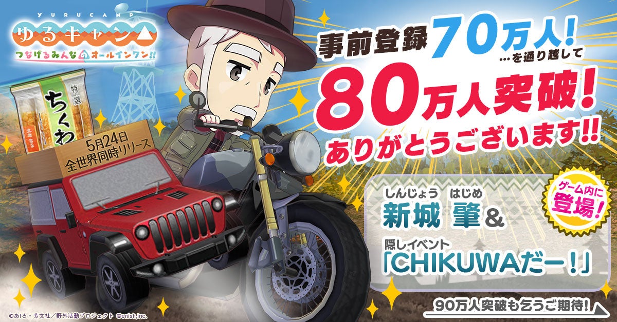 「ゆるキャン△ つなげるみんなのオールインワン!!」の事前登録者数が、わずか2週間で一気に70万&80万人を突破したことを記念し、ゲストキャラクターとして「リンの祖父・新城 肇」が、隠しイベントとしてへやキャン△で登場した「CHIKUWAだー!」がゲーム内に登場することが決定しました。