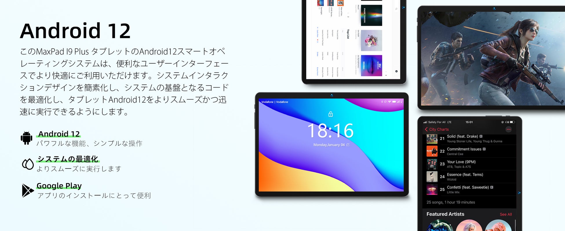 BMAX I9Plus タブレットは最新のAndroid 12 システムを搭載しています。 元の Android 11 システムと比較して、より安定した動作能力を備えています。 元の 3GB+32GB メモリから現在の 4GB+64GB メモリに拡張します。 収納スペースが大きくなったので、生活に残しておきたい写真、音楽、電子書籍をより多く保存できます。
