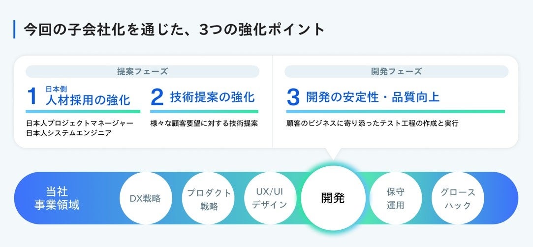 また、衣笠氏が率いるイクシアス社には品質管理や採用に長けたキーメンバーをはじめ、日本人のプロジェクトマネージャーやエンジニアが在籍しております。衣笠氏及びイクシアス社のメンバーを当社グループに迎えることで、主に、以下の点で当社が提供するハイブリッド型サービスの提供価値のスピーディーな向上が期待できます。