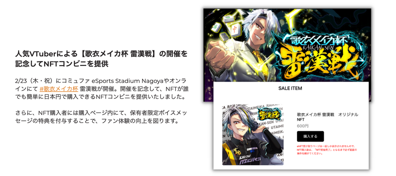 NFTを日本円で販売でき、さらにNFT購入者に対して限定コンテンツを用意できるサービスです。 ウォレットを持っていない方でもNFTを購入OK!