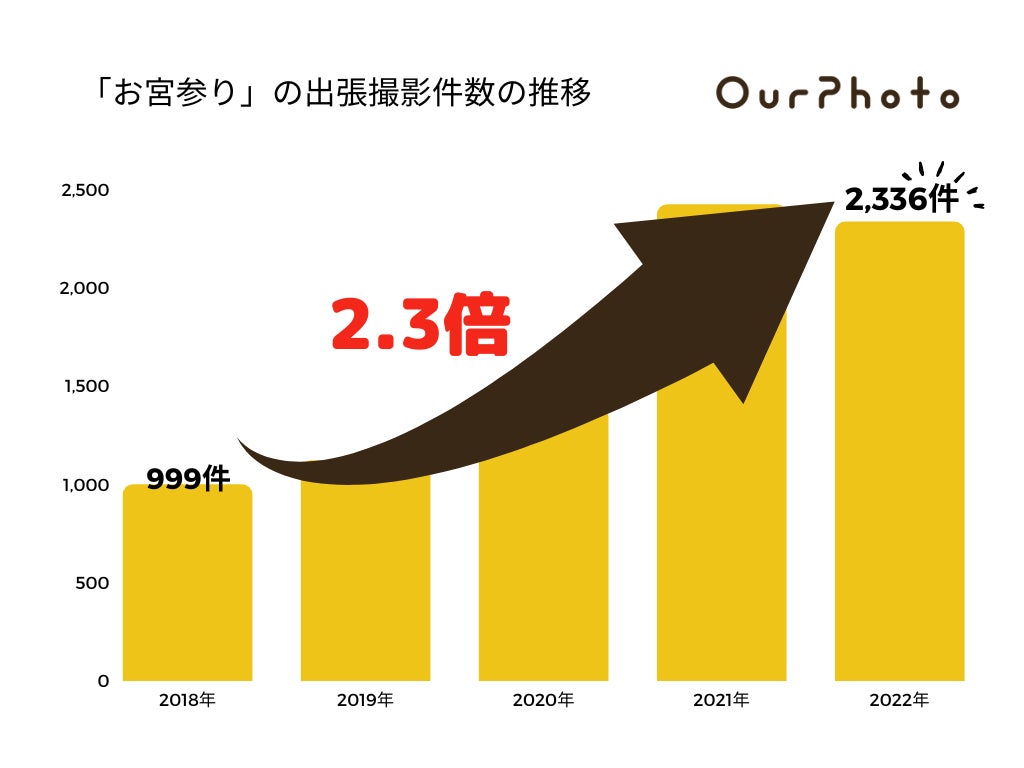 新型コロナウイルス感染拡大前も「お宮参り」の出張撮影は多くありましたが、初めての緊急事態宣言が解除されて以降(2020年6月頃)は、撮影時においても密を避ける傾向が出てきたこと、また出張撮影の認知度が高まったことから出張撮影依頼件数がさらに増え、2022年は2018年と比べて2.3倍と大きく伸びています。