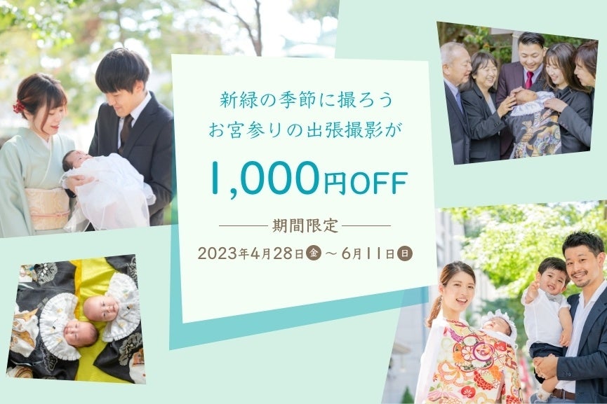 そしてこの度「OurPhoto」では、この新緑の季節に、「お宮参り」で赤ちゃんの健やかな成長をお祈りするとともに写真として思い出に残していただきたいという思いから、2023年4月28日(金)より、「お宮参り」の出張撮影で利用できるクーポンを配布するキャンペーンを実施いたします。「OurPhoto」の「お宮参り」ジャンルで出張撮影をご予約の際に、クーポンコードを入力していただくと撮影料金が1,000円OFFになります。
