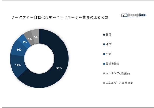 世界のワークフロー自動化市場は、エンドユーザー業界別に、銀行、通信、小売、製造と物流、ヘルスケアと医薬品、エネルギーと公益事業に分割され、需要と供給が分析されています。そのうち、銀行部門は 2035 年末までに最高の収益を得ると予想されています。シームレスなカスタマー エクスペリエンスのために、口座開設、買掛金、閉鎖手続き、クレジット カード処理、ローン処理など、多くの銀行業務を効率的に自動化できます。たとえば、開発途上国の住民の 71% を含め、現在、世界中の個人の約 76% がアカウントを持っています。さらに、中国を除く発展途上国の成人の約 40% が、カード、電話、またはインターネットを使用してデジタル ベンダーの支払いを行うことを決定し、新興経済国の成人の 3 分の 1 以上が公共料金を直接支払いました。アカウントは、パンデミックが始まった直後に初めてそうしました。