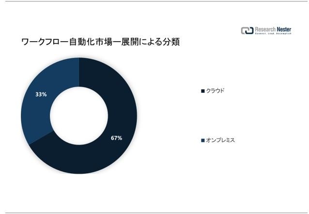 世界のワークフロー自動化市場は、クラウドおよびオンプレミスへの展開によって、需要と供給についてもセグメント化および分析されています。その中でも、クラウド セグメントは、予測期間中に大幅な成長が見込まれています。このセグメントの成長は、組織によるクラウドの採用の増加と、在宅勤務者の増加に起因する可能性があります。クラウドベースのワークフローの自動化により、従業員は離れた場所にいても接続を維持し、ファイルを共有し、タスクを効率的に完了することができます。さらに、デジタル時代への移行が進むにつれて、クラウドサービスの需要が高まっており、これもセグメントの成長を後押しし、市場の成長をさらに後押しすると推定されています。