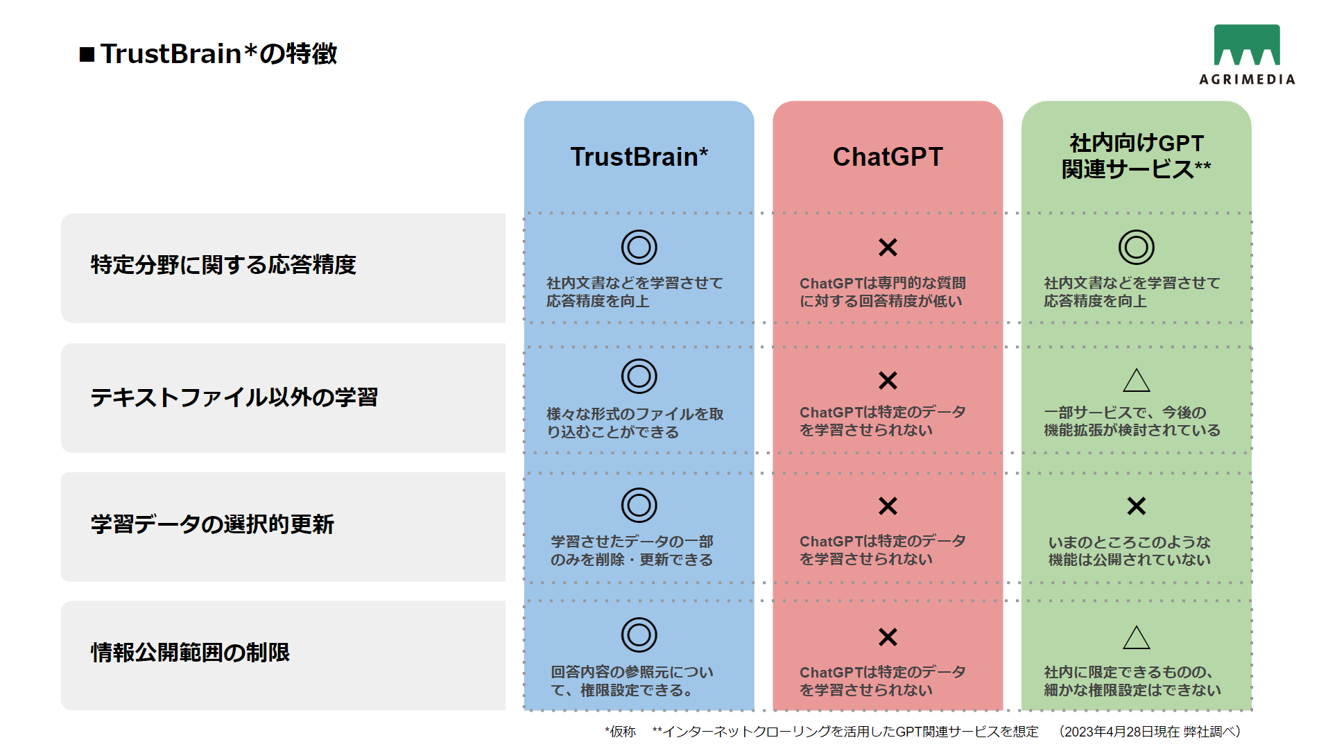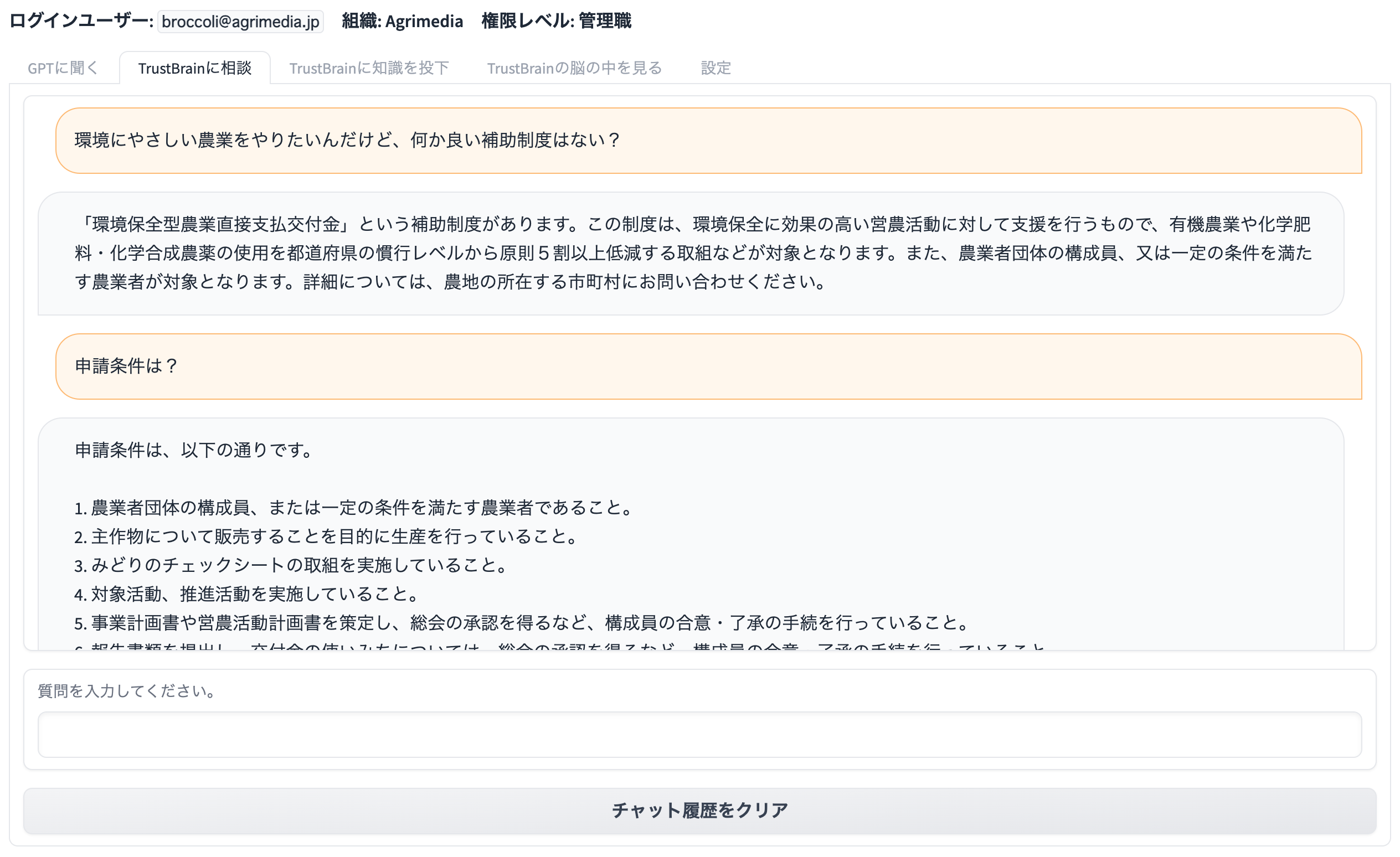 さらには、このTrustBrain* をベースに、当社の農業情報データベース「AGRIDB」や農林水産関連の行政公開文書を学習させた農業特化型経営支援AIを開発中です。農業経営者が、補助金申請や経営、生産に関する悩み事を相談するケースや、当社が手掛ける農業参入を考える法人へのコンサルティングやリサーチ業務などにおいての活用が期待されています。