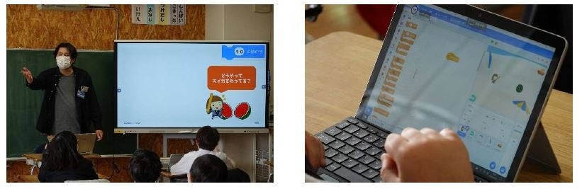 オリジナルキャラクターの「美雲このは」(※2)のデザインの『スイカ割りゲーム』の実践と『図形の書き描き方』を学ぶという内容で実施いたしました。児童たちはプログラミングの基礎である、「順次」「分岐」「繰り返し」を課題に取り組みながら学び、正解の動きになるために休み時間も忘れるほどにのめりこんで何度も試して積極的に授業に取り組んでいました。正解が一つではないことから児童の個性や創造性を見ることができました。