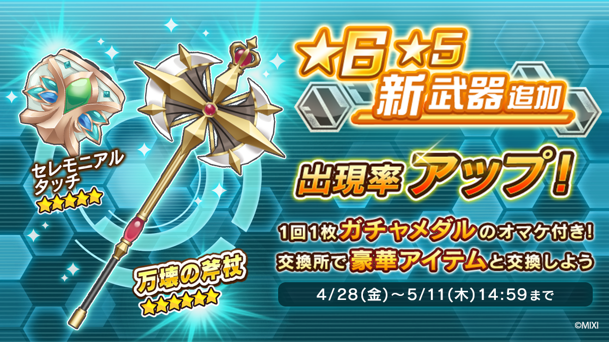 4月28日(金)メンテナンス後~ 5月11日(木)14:59まで新規武器★6「万壊の斧杖」★5「セレモニアルタッチ」が武器ガチャより、出現率アップで登場します。