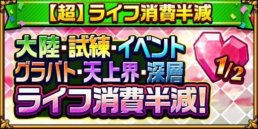 期間中、大陸・試練・イベント・グランバトル・天上界NORMAL・現代大陸深層で消費するライフが半減されます。