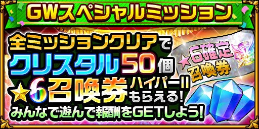 GWスペシャルミッションを全てクリアすると、後日クリスタル50個と「★6確定召喚券ハイパーⅡ」がもらえます。