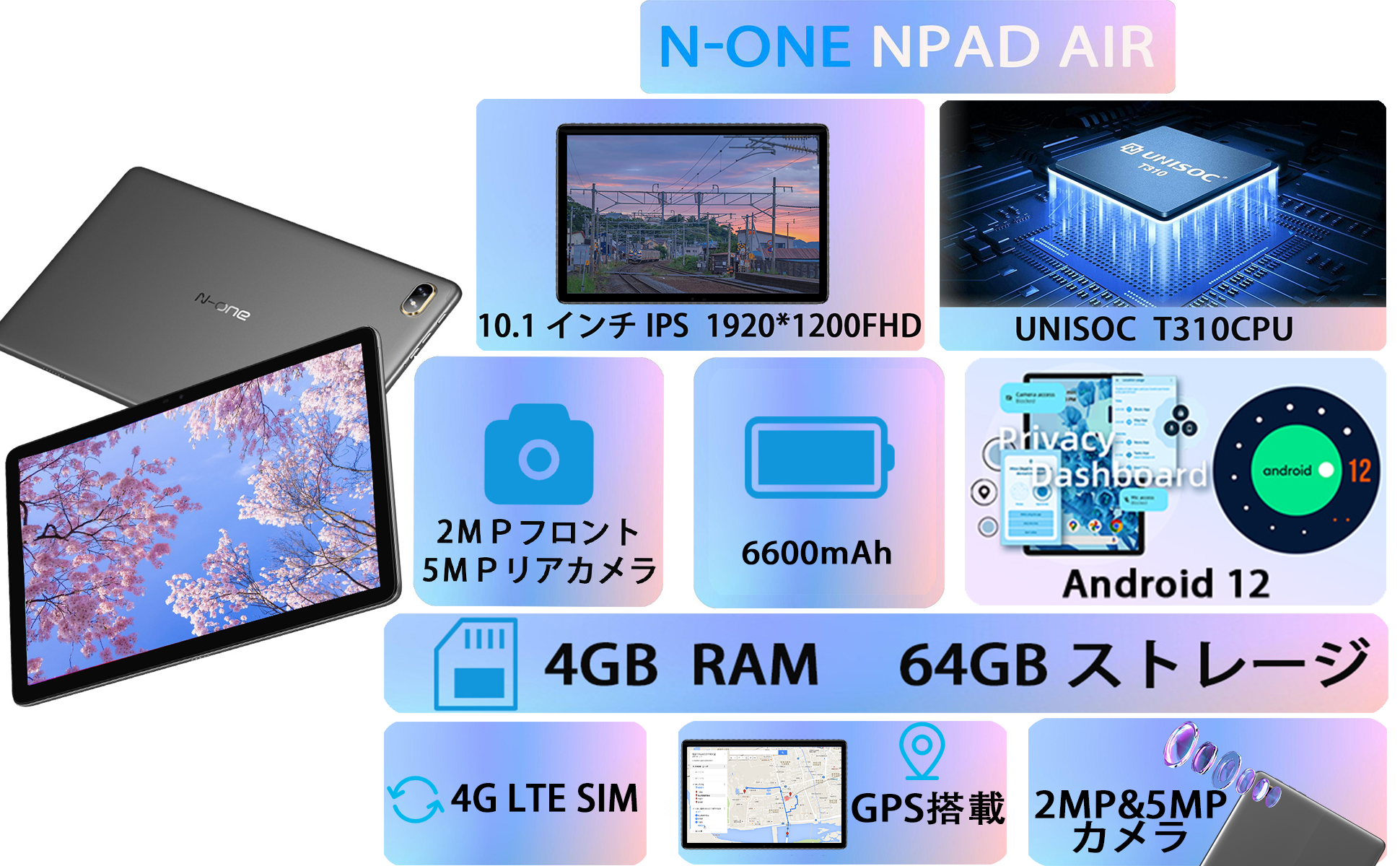1920*1200解像度 HD IPSディスプレイ、T310 CPU最大2.0GHz、1TB TF拡張可能+4GB RAM+64GB ROM、GMS認証+6600mAh大容量バッテリー+Type C充電+2.4G/5G Wi-Fi対応、4G LTE SIM通話 タブレット10.1インチ、Bluetooth5.0+GPS+2MP/5MPカメラ、日本語取扱説明書付き