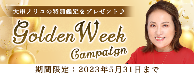 『Golden Week Campaign』では、5月のはじめのゴールデンウィークを迎えるにあたり、お休みの日もその後も、あなたに幸せが訪れるよう…大串ノリコの特別開運鑑定をご用意致しました。対象鑑定を1つ占っていただくごとに、期間限定の開運鑑定を1つプレゼント!ぜひ、この機会に大串ノリコの占いをお楽しみください。