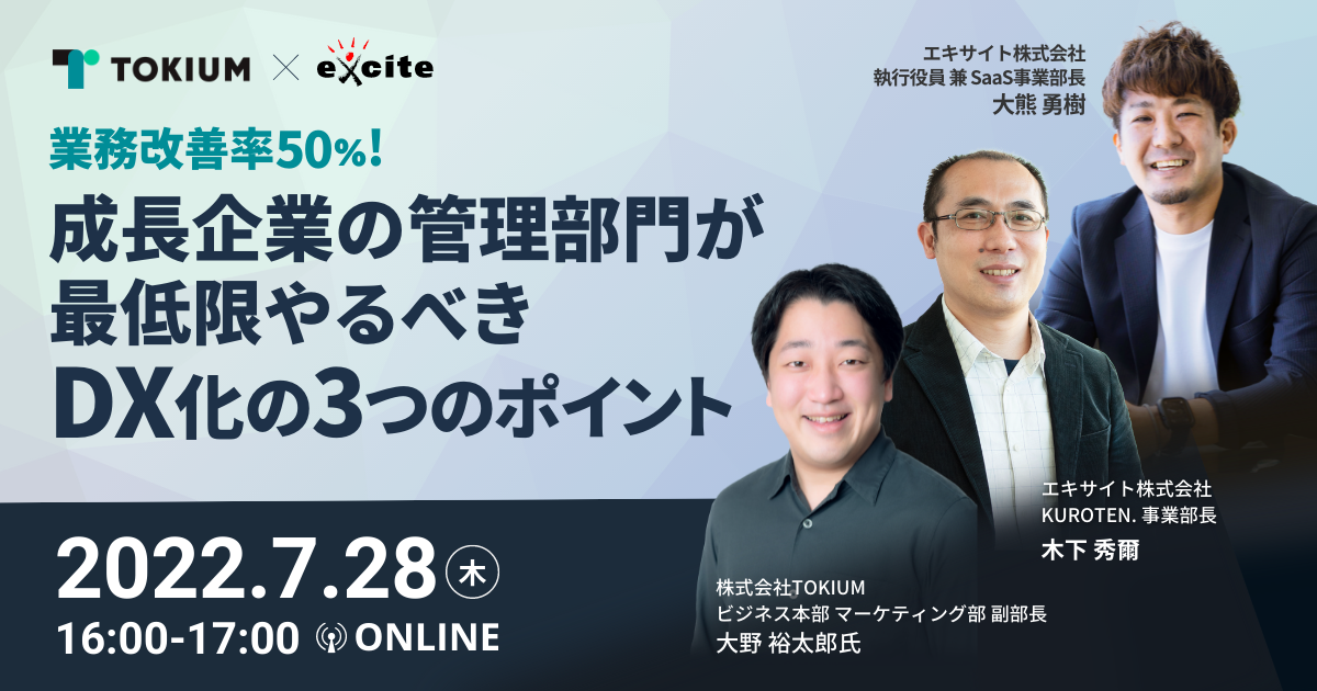 | 登壇者 | 株式会社TOKIUM ビジネス本部 マーケティング部 副部長 大野裕太郎 氏 エキサイト株式会社 執行役員 兼 SaaS事業部長 大熊 勇樹 エキサイト株式会社 KUROTEN. 事業部長 木下 秀爾 |