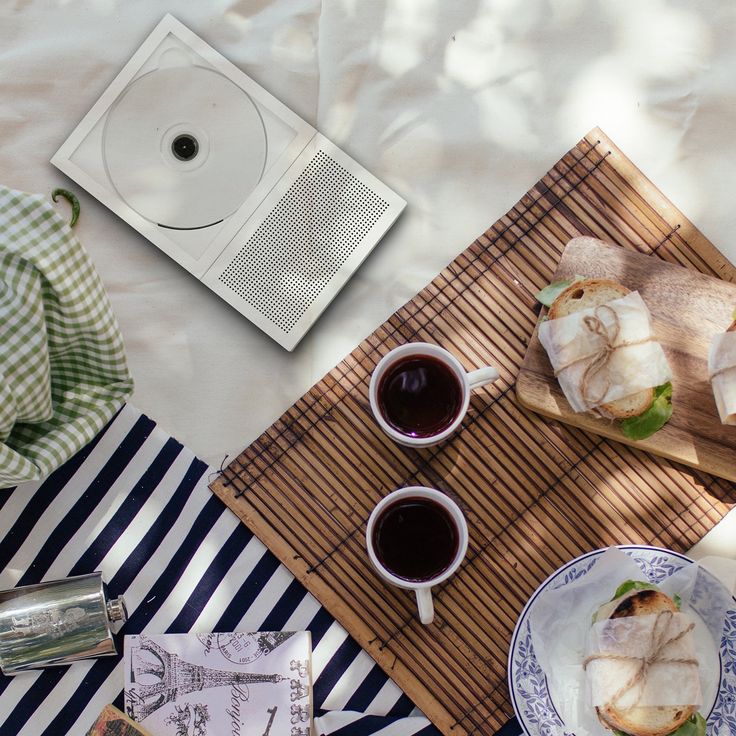 CP1のシンプルでミニマルなデザインを踏襲しつつ、新たにスピーカーを搭載。厚さはCP1とほぼ同等の薄さで表現。書籍の様な佇まいを目指しました。また今回もCDプレーヤー内部に歌詞カードを収納し写真やアートを飾る様にお愉しみいただくことができます。