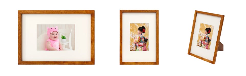 地球環境に配慮したサステナブルな「エコラフレーム」は、シンプルでスタイリッシュなデザインです。飾る際にご自宅の壁に負担が少ないよう軽量設計で開発し、重さはわずか394グラム。特に表面はガラスではなく、クリアなペット素材を採用しており、地震などで落下してもガラスが飛び散ることなく軽さと安全性を活かした安心な設計です。デザインについては大胆な中窓で写真を引き立てるよう、あえて広めの中窓に写真をセットできるように設計し、よりお子さまの表情や背景が際立つデザインにしました。