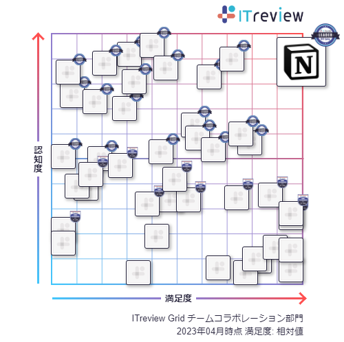 Notionは、エントリーしている チームコラボレーション、プロジェクト管理、タスク管理、業務可視化ツール、AIライティングツールの全5部門において、顧客満足度と認知度ともに高い製品に贈られる「Leader」に選出されました。Leaderに選出されるのは、チームコラボレーション部門では2020 Summerでの初選出以来12期連続、その他の4部門では今期が初の選出となります。