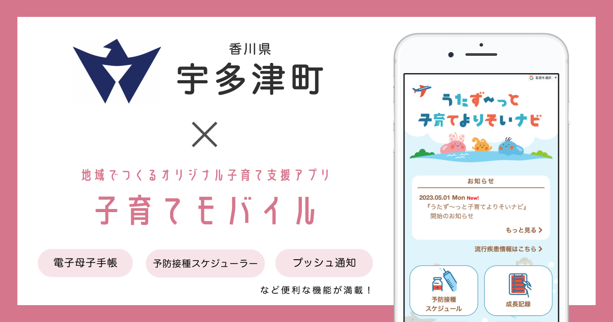 これまで、宇多津町では子育てに関する情報をホームページや町広報によりお知らせしていましたが、子育てに関する様々な情報を保護者の方々の好きなときに、いつでも、気軽に得ることができるよう、そして各種事業がオンラインでも予約ができるよう、子育て支援アプリ「子育てモバイル」を導入する運びとなりました。宇多津町オリジナルのデザインを施し、子育て支援アプリ「うたず~っと子育てよりそいナビ」として提供いたします。