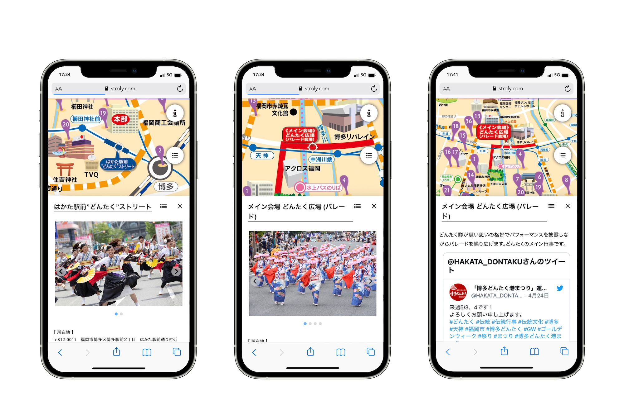 そこでStrolyは直感的に見たいイベントや、行ってみたい会場の情報を直ぐに見つけられる体験をしていただけるデジタルマップ版「どんたくマップ」を作成いたしました。