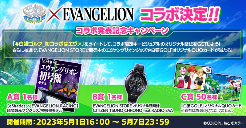 また、公式Twitterでは、コラボイベントの開催を記念して『エヴァンゲリオン』公式グッズや、『白猫GOLF』オリジナルQUOカード(1,000円分)などが当たるキャンペーンを実施しています。ぜひご参加ください。