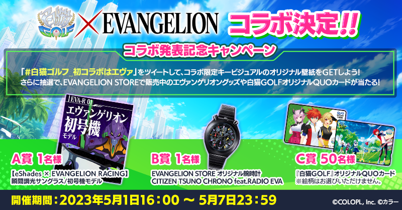また、公式Twitterでは、コラボイベントの開催を記念して『エヴァンゲリオン』公式グッズや、『白猫GOLF』オリジナルQUOカード(1,000円分)などが当たるキャンペーンを実施しています。ぜひご参加ください。