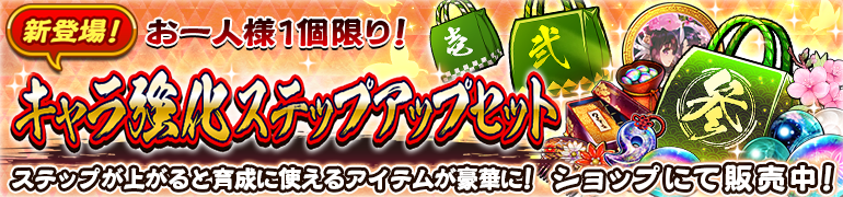 キャラクター強化に必要な各種アイテムや無償宝珠がお得に手に入る内容になっており、ステップが上がる毎に内容が豪華になります。