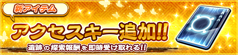 「アクセスキー」は、使用することで一定時間待つと手に入る遺跡探索の定時報酬とは別に、使用する遺跡探索レベルに応じた「探索報酬」を獲得することができます。