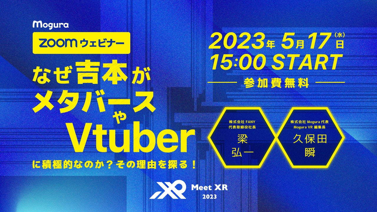 Mogura VR編集長の久保田がファシリテーターとして、「なぜ吉本がメタバースやVtuberに積極的なのか?その理由を探る!」というテーマで、株式会社FANYの事例紹介や、メタバースビジネスを展開するうえでの課題感などについてお話しいただきます。質疑応答の時間も設けておりますので、ぜひリアルタイムでご参加ください。