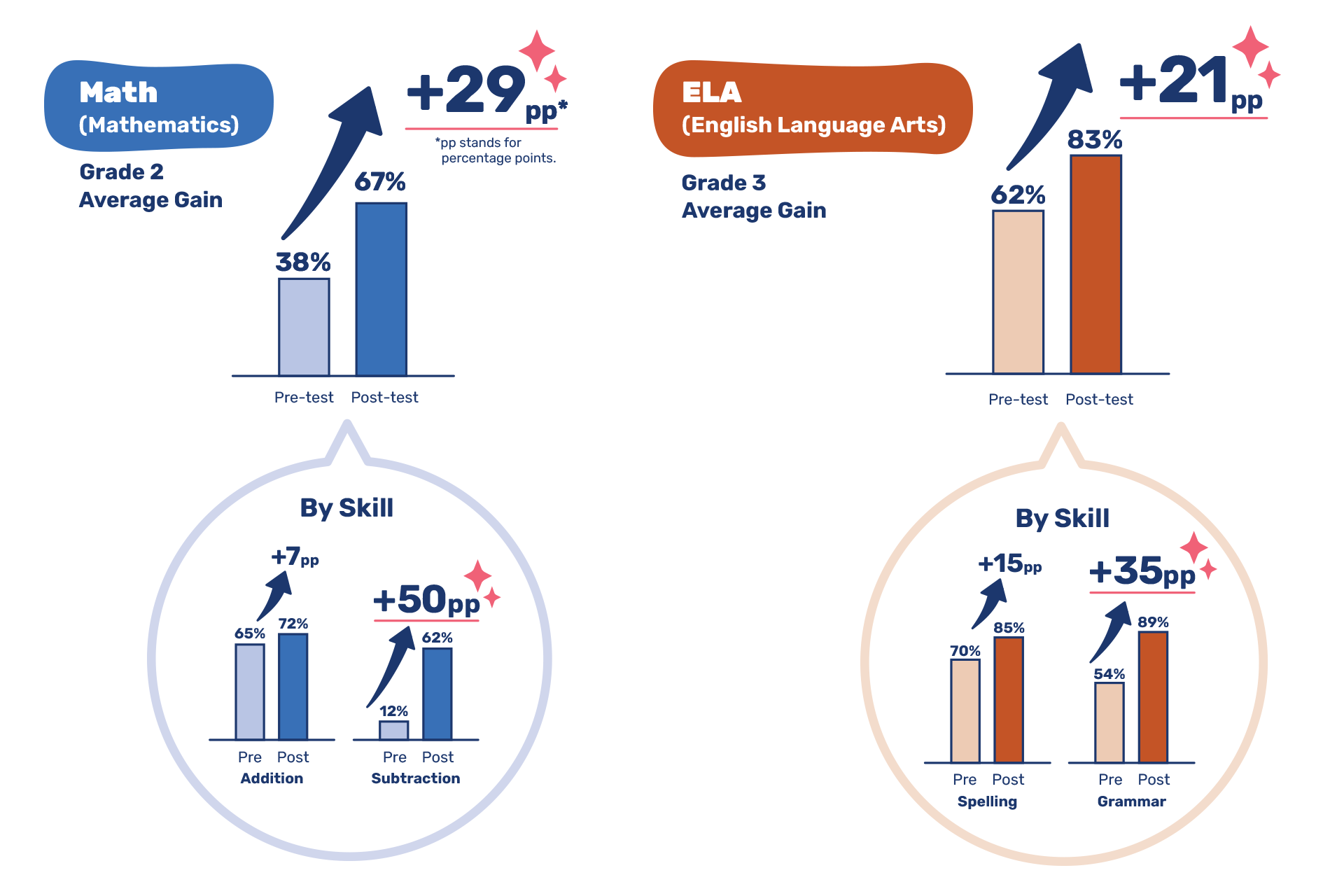 発売に先立ち、米国の子どもたちを対象とし、「Smile Zemi」の実証実験を行いました。利用前と利用後に実施したペーパーテストの結果では、正答率がGrade2の算数(Mathematics)で29ポイントアップ(38%から67%)、Grade3の国語(English Language Arts)で21ポイントアップ(62%から83%)と、大幅に向上しました*。