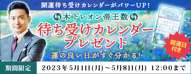 フジテレビ系列で放送中の占い番組『突然ですが占ってもいいですか?』で人気を博している木下レオン。ただいま、月額公式サイト『木下レオン◆帝王数』にて、『5月の開運日が分かる待ち受けカレンダープレゼント』キャンペーンを開催中です。期間中、対象の占いメニュー購入で、開運日がひと目で分かる5月のオリジナル待ち受けカレンダーがついてくるお得なキャンペーンとなっております。ぜひこの機会にお試しください。