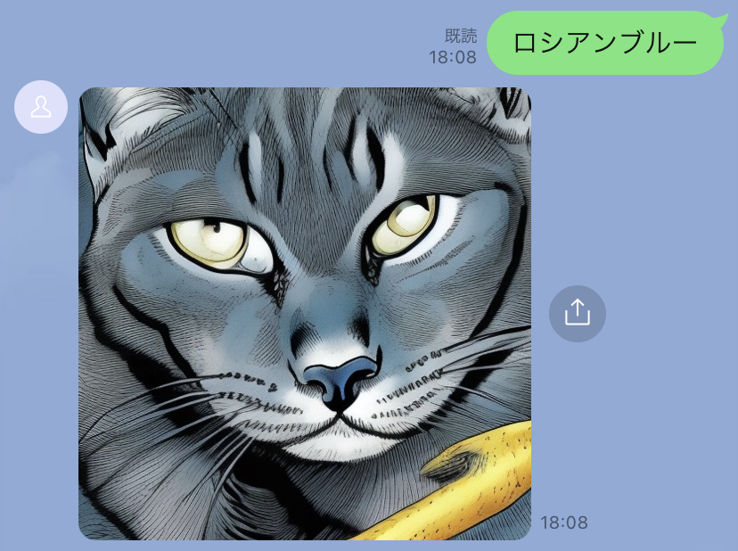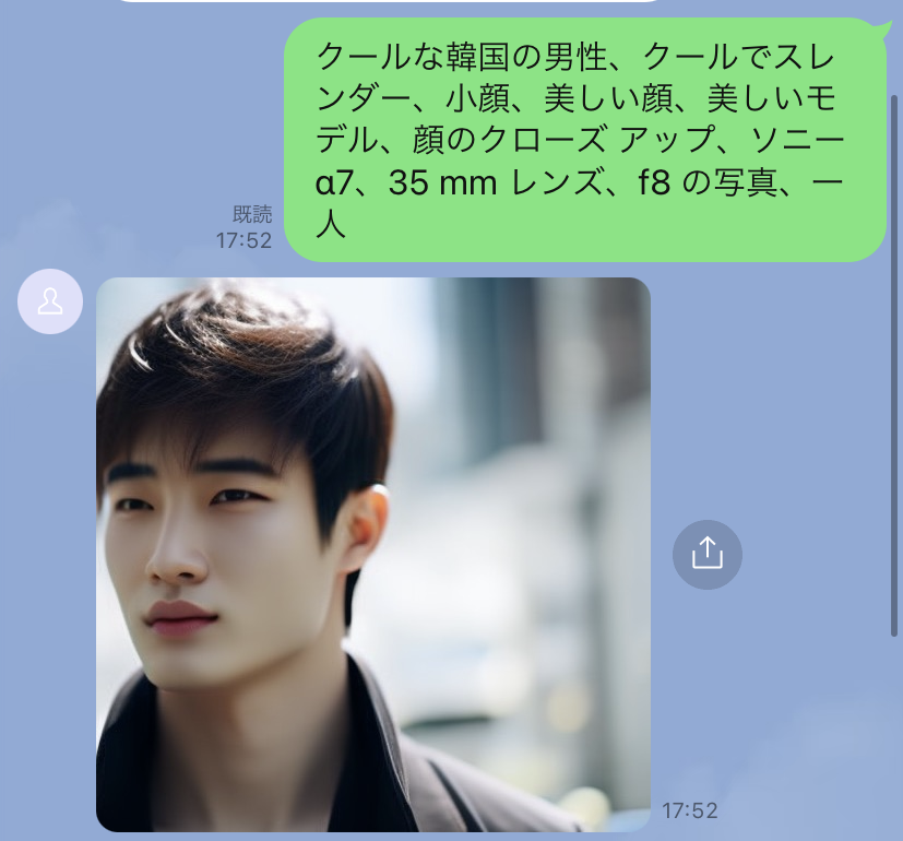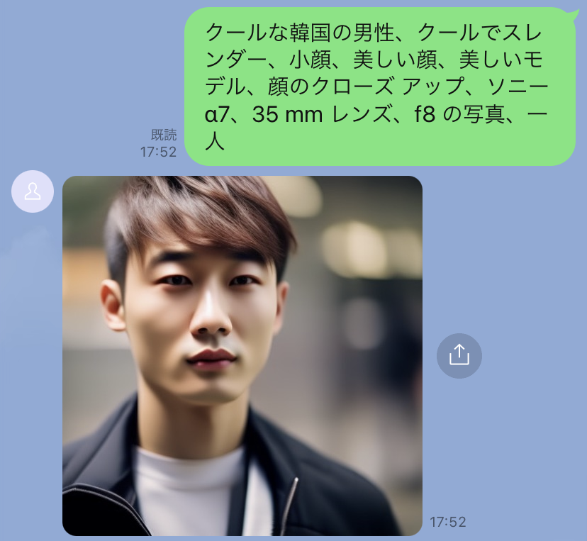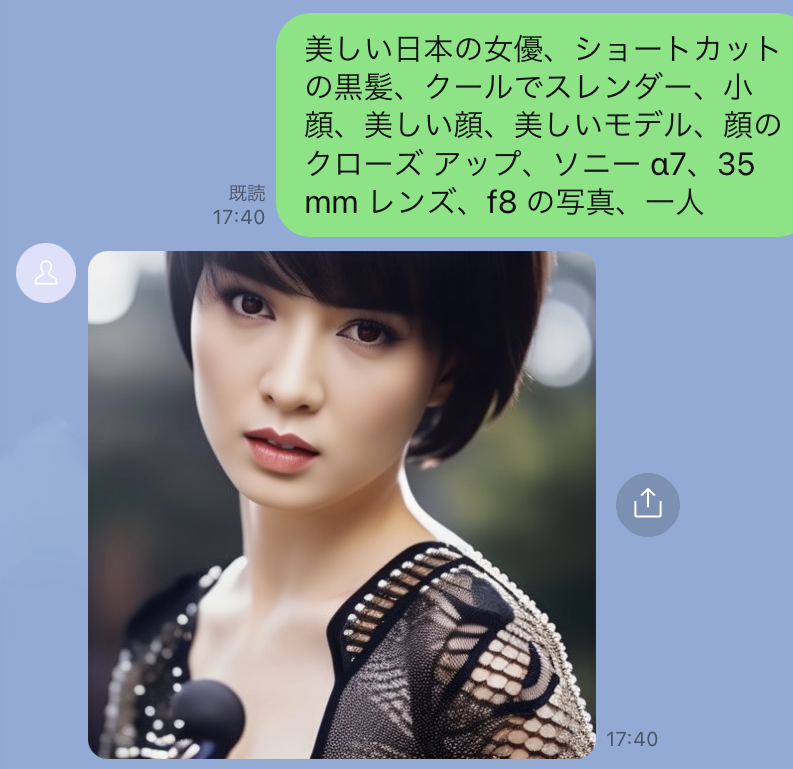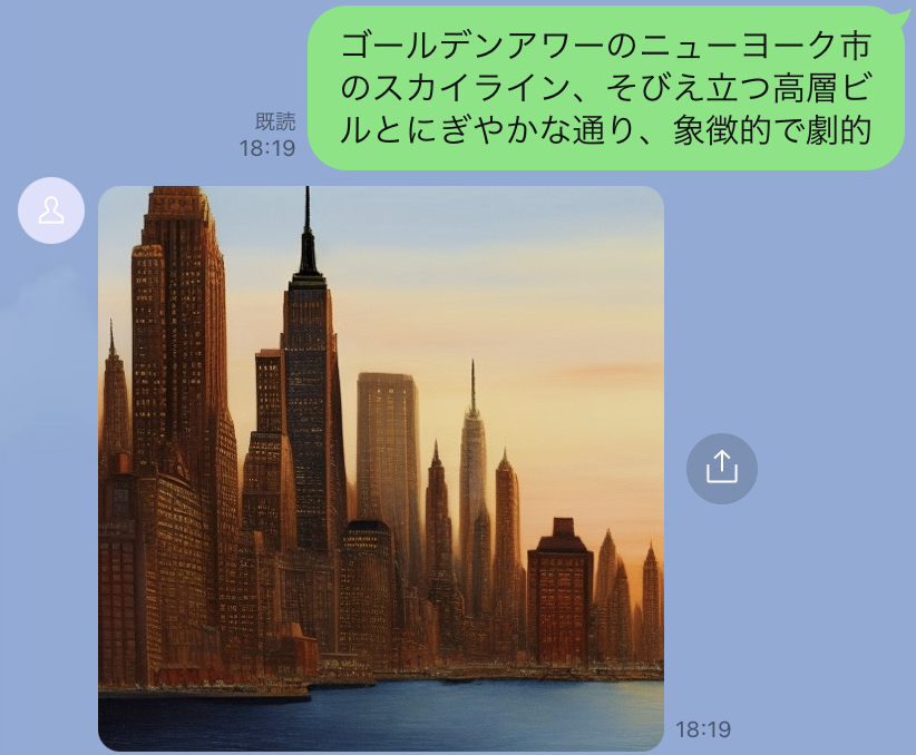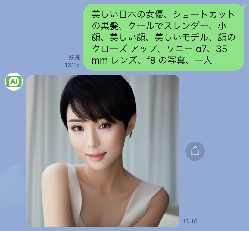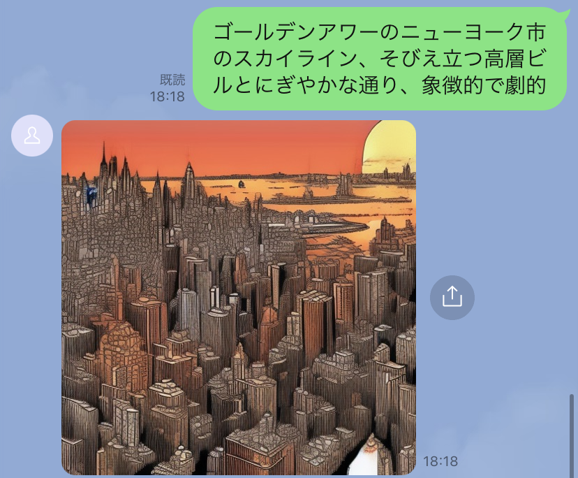 LINEのメッセージで作成してもらいたい画像を文章を入力するだけで画像が生成されます。あなた好みの画像を無限に生成することが可能です。「ビジネスシーン」「お子様との遊び」「今週のコーディネートを決める」「髪型イメージを出力する」「芸術の練習」「子供へ動物の種類を覚えてもらう」利用用途は様々です。