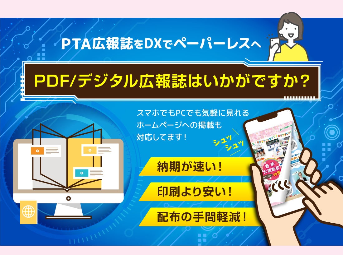 紙で配布が一般的なPTA広報誌を、スマホやタブレットで閲覧できるデジタル広報誌としてお届けいたします。