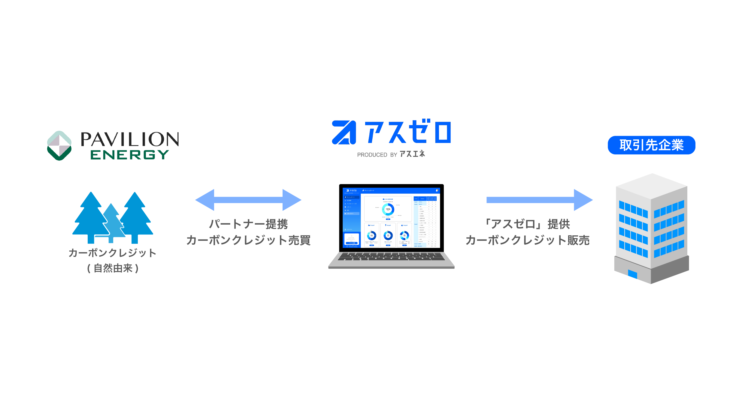 当社では、パビリオン・エナジーの保有するカーボンクレジットを「アスゼロ」の導入企業に提供することで、CO2排出量見える化から削減までをワンストップで支援し、企業のネットゼロ達成に貢献していきます。