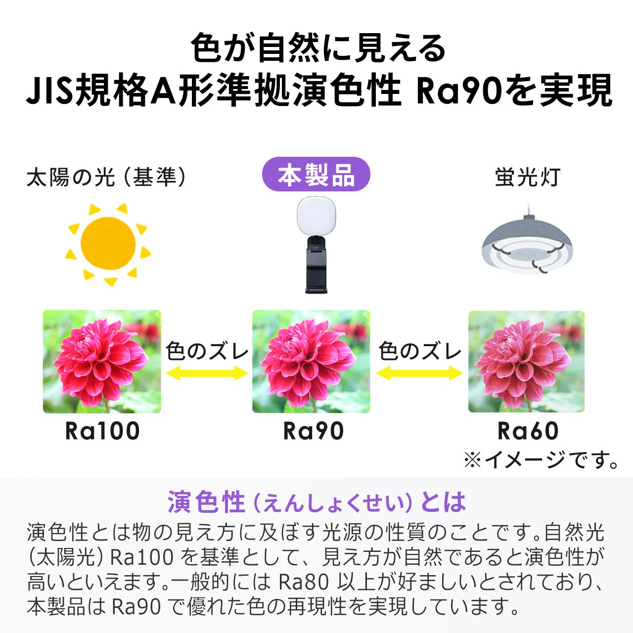 演色性は、JIS規格A形準拠Ra90を実現しています。